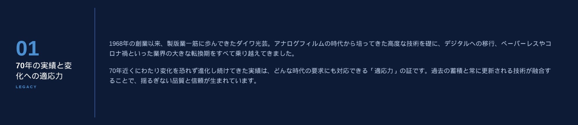 アナログの時代から高度な技術を磨き、デジタル化・自動化の波も乗り越えてきた実績と適応力が私たちの土台です。
