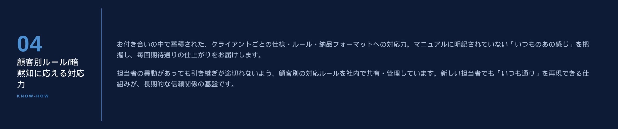 単なる技術提供にとどまらず、クライアントの「いつも通り」に応え続けることが、私たちの強みです。